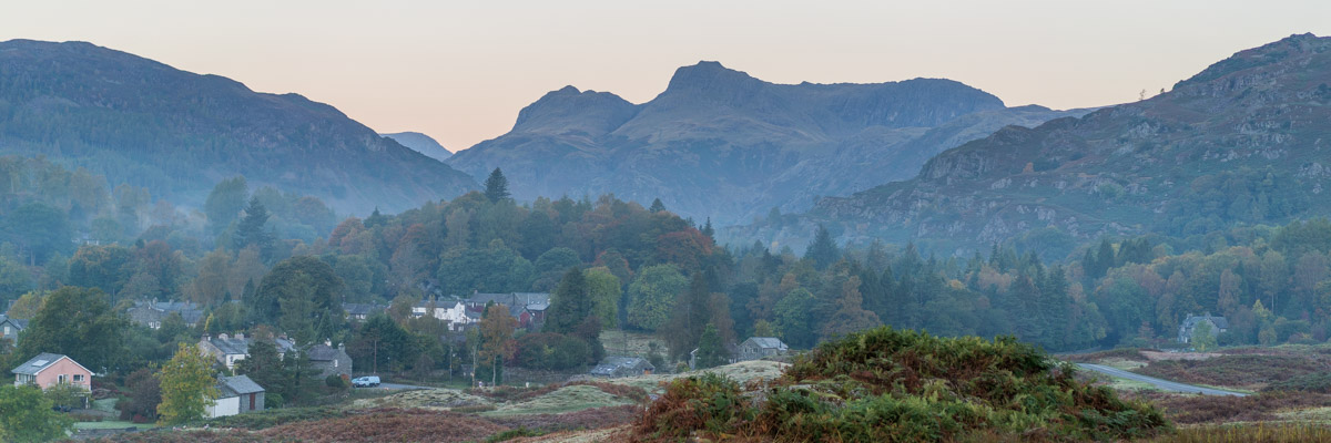 Elterwater Village and the Langdale Pikes from the Cattlegrid.