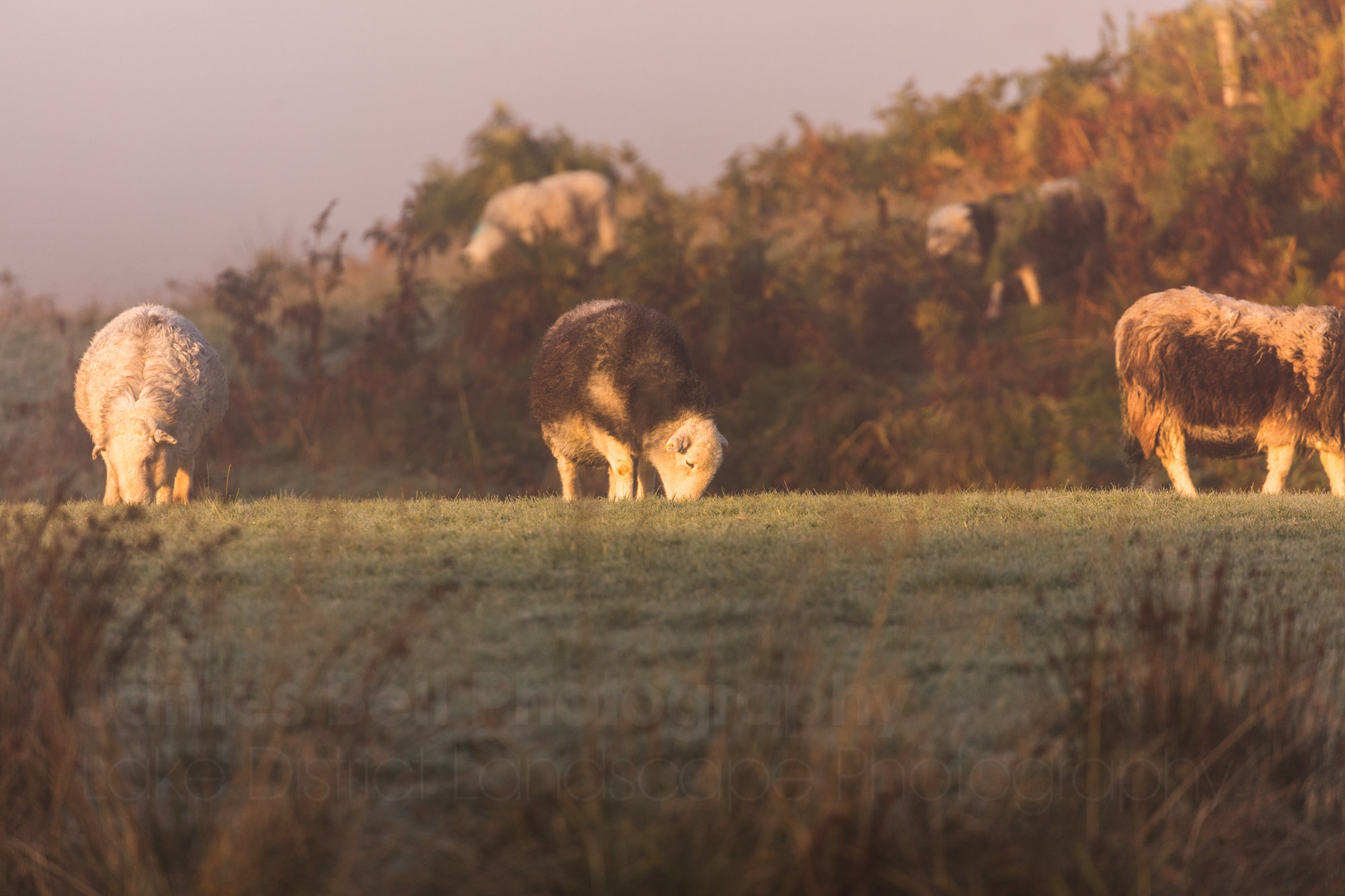 A nice moment as the sun hits the tress opposite. Herdwicks approaching to the left.